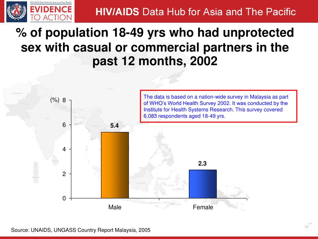 % of population 18-49 yrs who had unprotected sex with casual or commercial partners in the past 12 months, 2002 The data is based on a nation-wide survey in Malaysia as part of WHO’s World Health Survey 2002. It was conducted by the Institute for Health Systems Research. This survey covered 6,083 respondents aged 18-49 yrs. Source: UNAIDS, UNGASS Country Report Malaysia, 2005