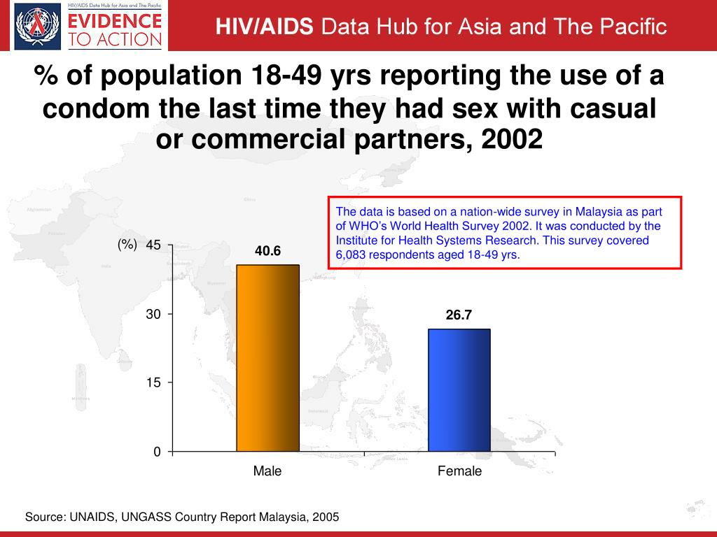 % of population 18-49 yrs reporting the use of a condom the last time they had sex with casual or commercial partners, 2002 The data is based on a nation-wide survey in Malaysia as part of WHO’s World Health Survey 2002. It was conducted by the Institute for Health Systems Research. This survey covered 6,083 respondents aged 18-49 yrs. Source: UNAIDS, UNGASS Country Report Malaysia, 2005