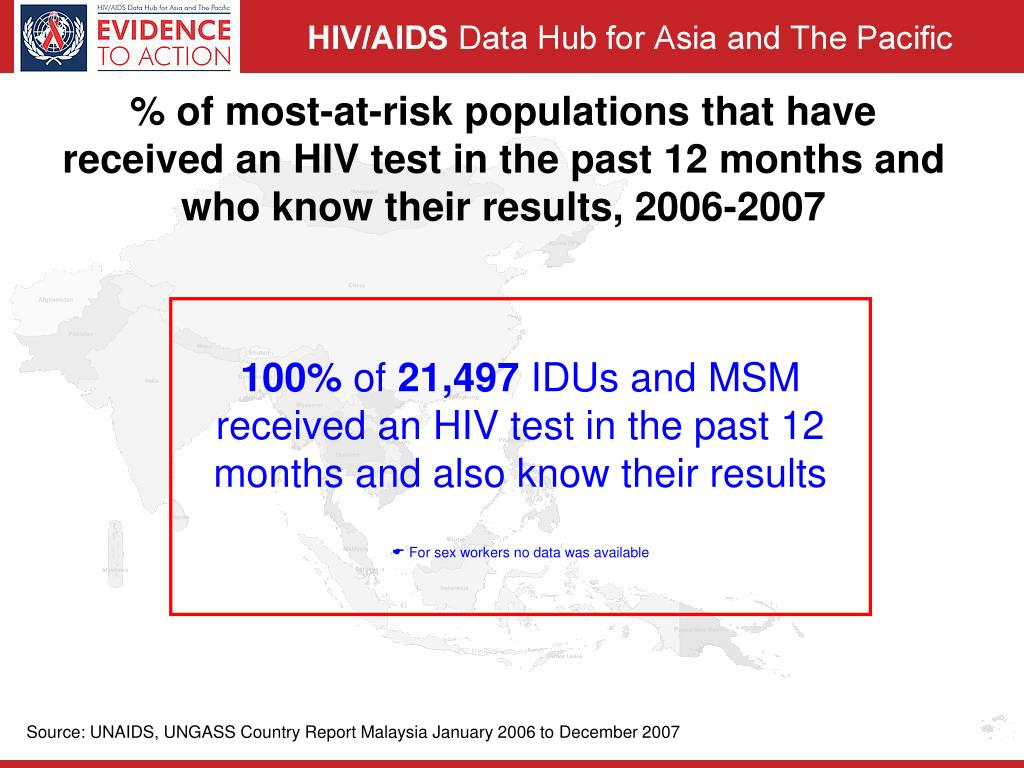 % of most-at-risk populations that have received an HIV test in the past 12 months and who know their results, 2006-2007 100% of 21,497 IDUs and MSM received an HIV test in the past 12 months and also know their results For sex workers no data was available Source: UNAIDS, UNGASS Country Report Malaysia January 2006 to December 2007