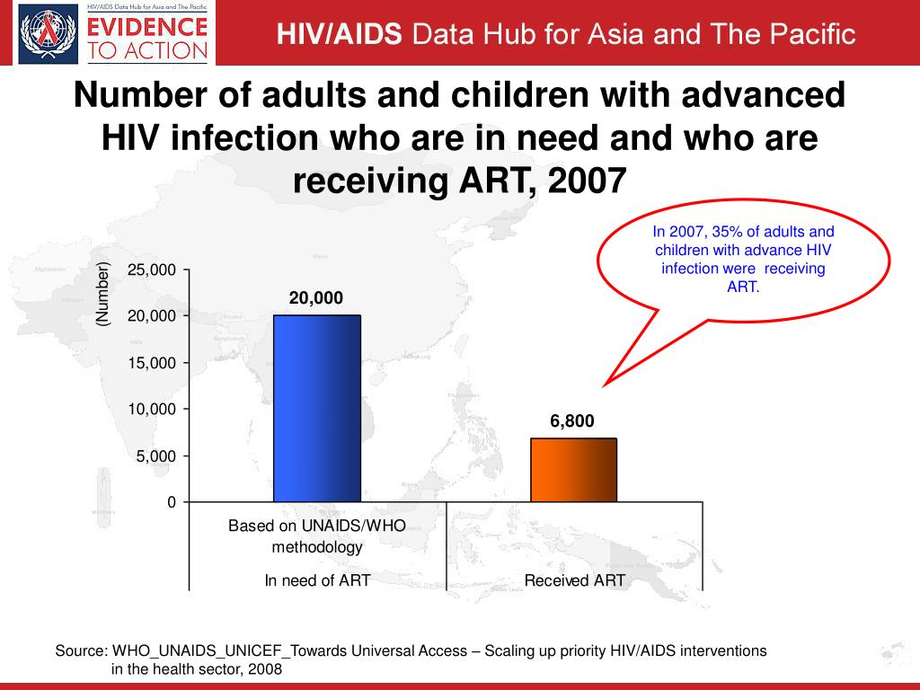 Number of adults and children with advanced HIV infection who are in need and who are receiving ART, 2007 In 2007, 35% of adults and children with advance HIV infection were receiving ART. Source: WHO_UNAIDS_UNICEF_Towards Universal Access – Scaling up priority HIV/AIDS interventions in the health sector, 2008