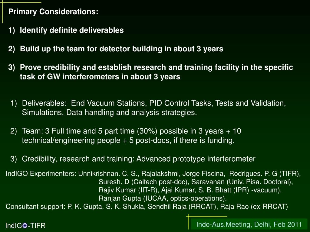 Primary Considerations: • Identify definite deliverables • Build up the team for detector building in about 3 years • Prove credibility and establish research and training facility in the specific task of GW interferometers in about 3 years • Deliverables: End Vacuum Stations, PID Control Tasks, Tests and Validation, Simulations, Data handling and analysis strategies. • Team: 3 Full time and 5 part time (30%) possible in 3 years + 10 technical/engineering people + 5 post-docs, if there is funding. • Credibility, research and training: Advanced prototype interferometer IndIGO Experimenters: Unnikrishnan. C. S., Rajalakshmi, Jorge Fiscina, Rodrigues. P. G (TIFR), Suresh. D (Caltech post-doc), Saravanan (Univ. Pisa. Doctoral), Rajiv Kumar (IIT-R), Ajai Kumar, S. B. Bhatt (IPR) -vacuum), Ranjan Gupta (IUCAA, optics-operations). Consultant support: P. K. Gupta, S. K. Shukla, Sendhil Raja (RRCAT), Raja Rao (ex-RRCAT) Indo-Aus.Meeting, Delhi, Feb 2011