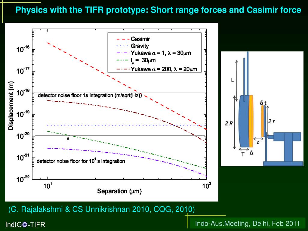 Physics with the TIFR prototype: Short range forces and Casimir force (G. Rajalakshmi & CS Unnikrishnan 2010, CQG, 2010) Indo-Aus.Meeting, Delhi, Feb 2011