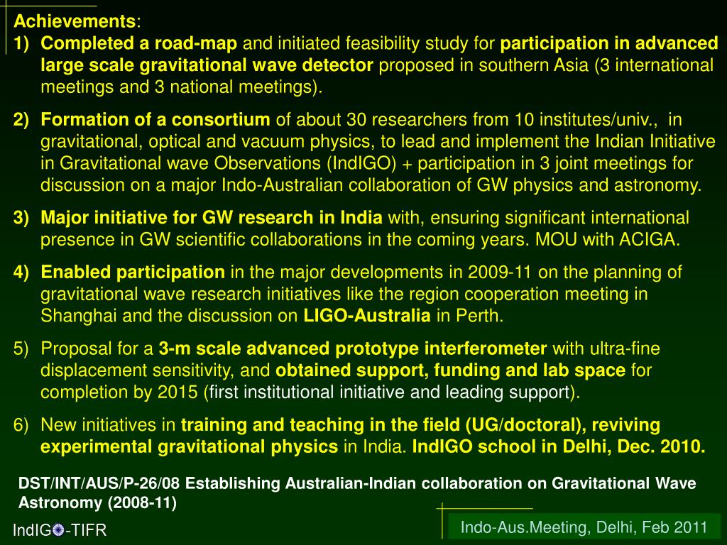 Achievements: • Completed a road-map and initiated feasibility study for participation in advanced large scale gravitational wave detector proposed in southern Asia (3 international meetings and 3 national meetings). • Formation of a consortium of about 30 researchers from 10 institutes/univ., in gravitational, optical and vacuum physics, to lead and implement the Indian Initiative in Gravitational wave Observations (IndIGO) + participation in 3 joint meetings for discussion on a major Indo-Australian collaboration of GW physics and astronomy. • Major initiative for GW research in India with, ensuring significant international presence in GW scientific collaborations in the coming years. MOU with ACIGA. • Enabled participation in the major developments in 2009-11 on the planning of gravitational wave research initiatives like the region cooperation meeting in Shanghai and the discussion on LIGO-Australia in Perth. • Proposal for a 3-m scale advanced prototype interferometer with ultra-fine displacement sensitivity, and obtained support, funding and lab space for completion by 2015 (first institutional initiative and leading support). • New initiatives in training and teaching in the field (UG/doctoral), reviving experimental gravitationalphysics in India. IndIGO school in Delhi, Dec. 2010. DST/INT/AUS/P-26/08 Establishing Australian-Indian collaboration on Gravitational Wave Astronomy (2008-11) Indo-Aus.Meeting, Delhi, Feb 2011