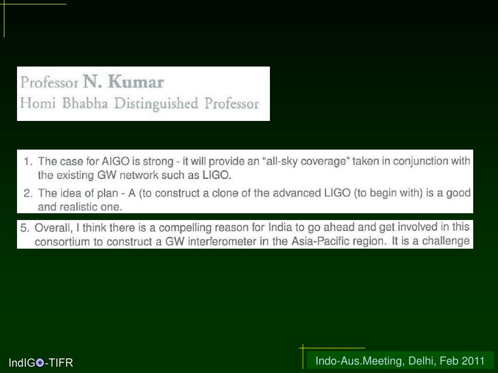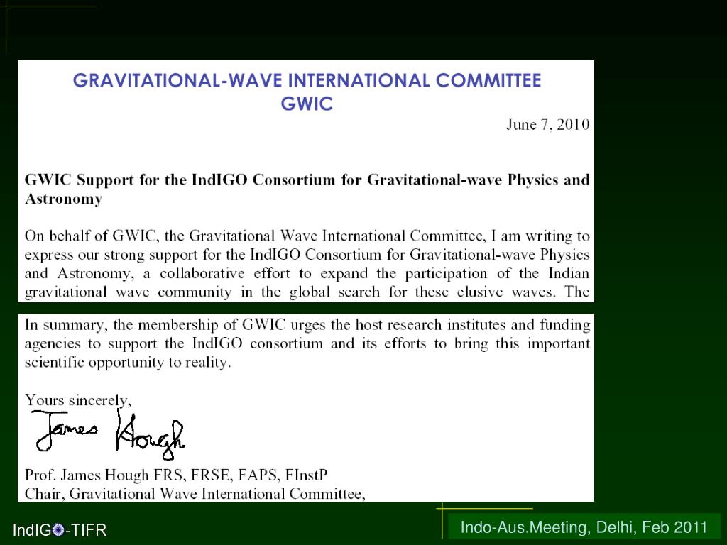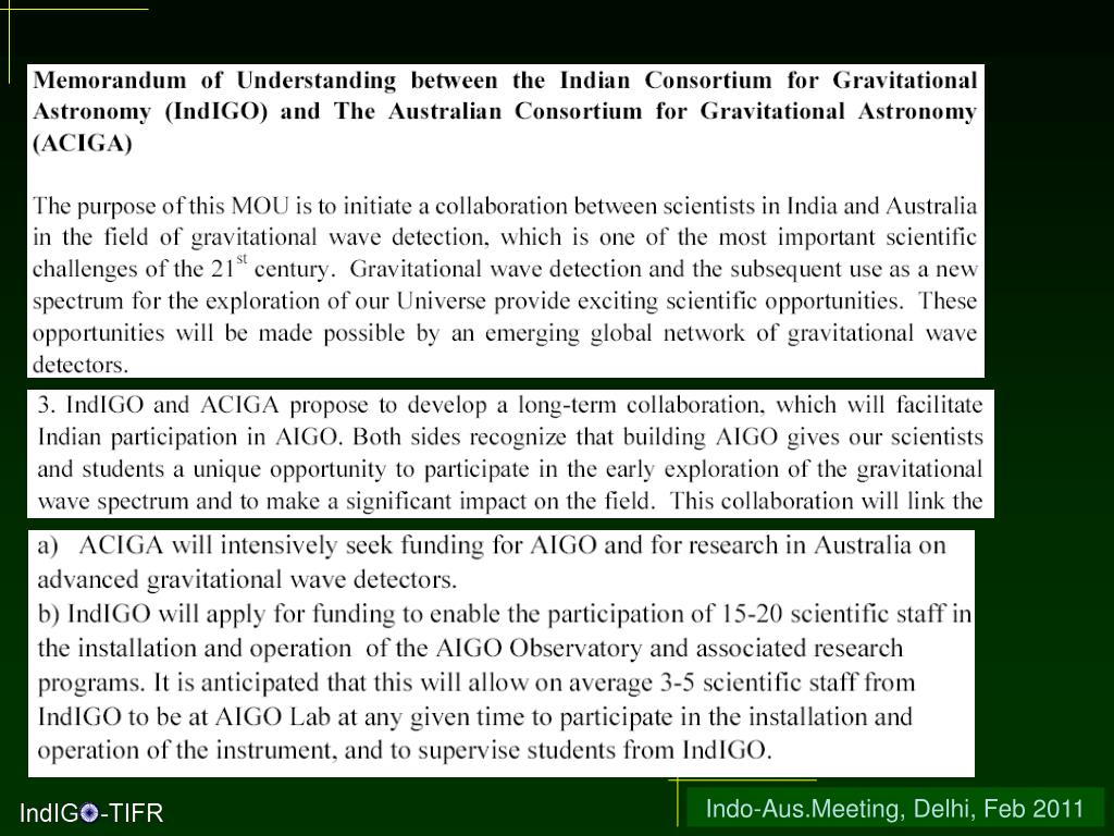 Progress: • Road map and preliminary proposal supported by GWIC, leading physicists in GW research and major GW research teams. • International Advisory Committee, National Steering Committee and Program Advisory Committee already in place. • MOU signed with ACIGA/UWA to pursue funding and manpower development to participate in the large scale detector effort in Australia. • Positive feedback and suggestions obtained from Office of Principal Science Advisor, Govt. of India, based on Dr Bhawalkar’s report encouraging to seek funding of the order of $20M for IndIGO participation in large scale detector. • Indo-US virtual centre for exchange program and collaboration in GW research approved in principle. • Growing national and international support for participation in the global GW astronomy program. Indo-Aus.Meeting, Delhi, Feb 2011