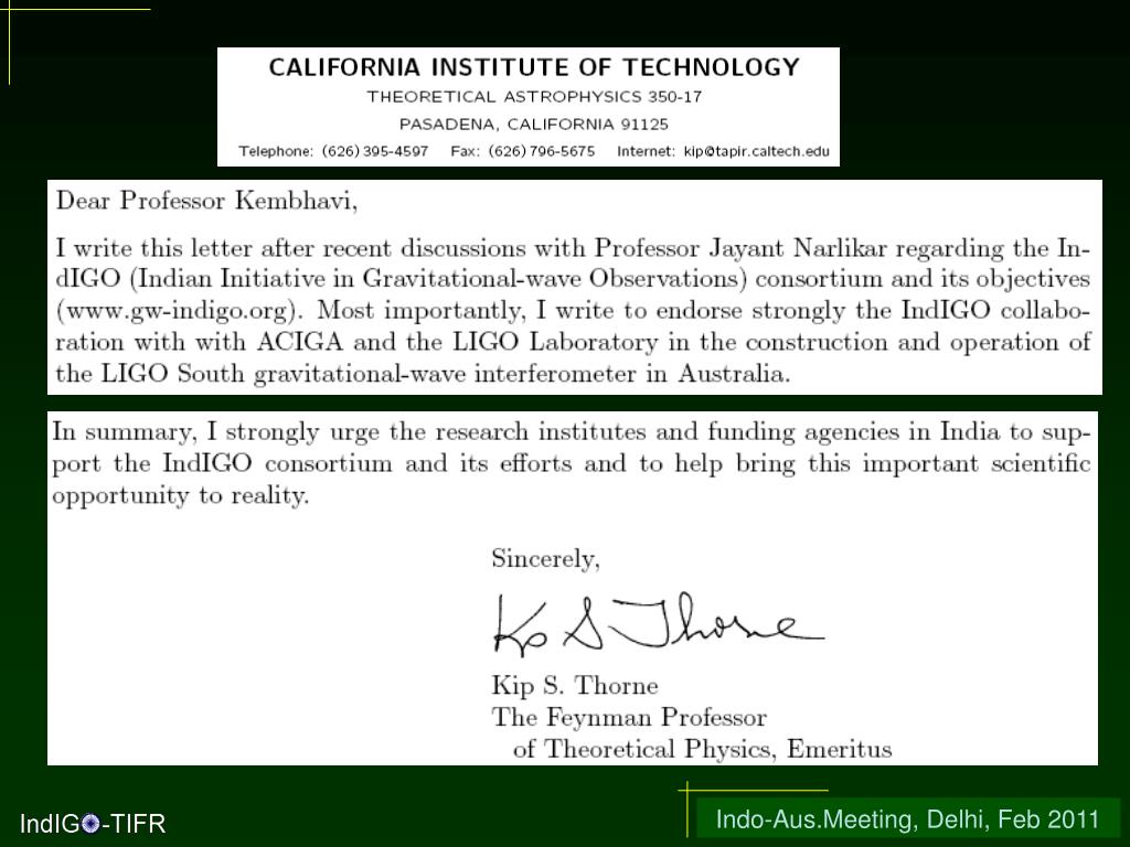 The IndIGO Consortium: Sanjeev Dhurandhar (Spokesperson) IUCAA, Pune Tarun Souradeep (Council) IUCAA, Pune Bala Iyer (Council chair) RRI, Bangalore C. S. Unnikrishnan (Council) TIFR, Mumbai Badri Krishnan Albert Einstein Institute, Germany Rana Adhikari Caltech, Pasadena P Ajith Caltech, Pasadena B Sathyaprakash Cardiff University T R Seshadri Delhi University Patrick Dasgupta Delhi University Anand Sengupta Delhi University (from Caltech) Biplab Bhawal Independent Rajesh Nayak IISER, Kolkata Archana Pai IISER, Trivandrum Suresh Doravari Caltech, Pasadena. Ajai Kumar IPR, Gandhinagar Ranjan Gupta IUCAA, Pune Sanjay Jhingan Jamila Milia, Delhi Sanjit Mitra JPL/LIGO, Caltech Jiwan Mittal RRCAT, Indore S Shukla RRCAT, Indore G Rajalakshmi TIFR, Mumbai A Gopakumar TIFR, Mumbai Soumya Mohanty UTB, Brownsville Sukanta Bose Washington University, Pullman K G Arun Chennai Mathematical Institute, Chennai Indo-Aus.Meeting, Delhi, Feb 2011