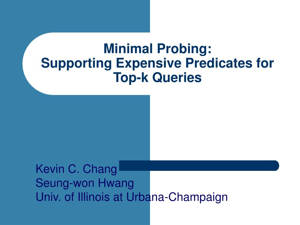 Minimal Probing: Supporting Expensive Predicates for Top-k Queries. Kevin C. Chang Seung-won Hwang Univ. of Illinois at Urbana-Champaign. Context: Top-k Queries. Ranked queries return top- k results, unlike Boolean Crucial for retrieving data by “soft” conditions