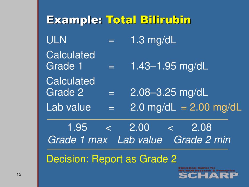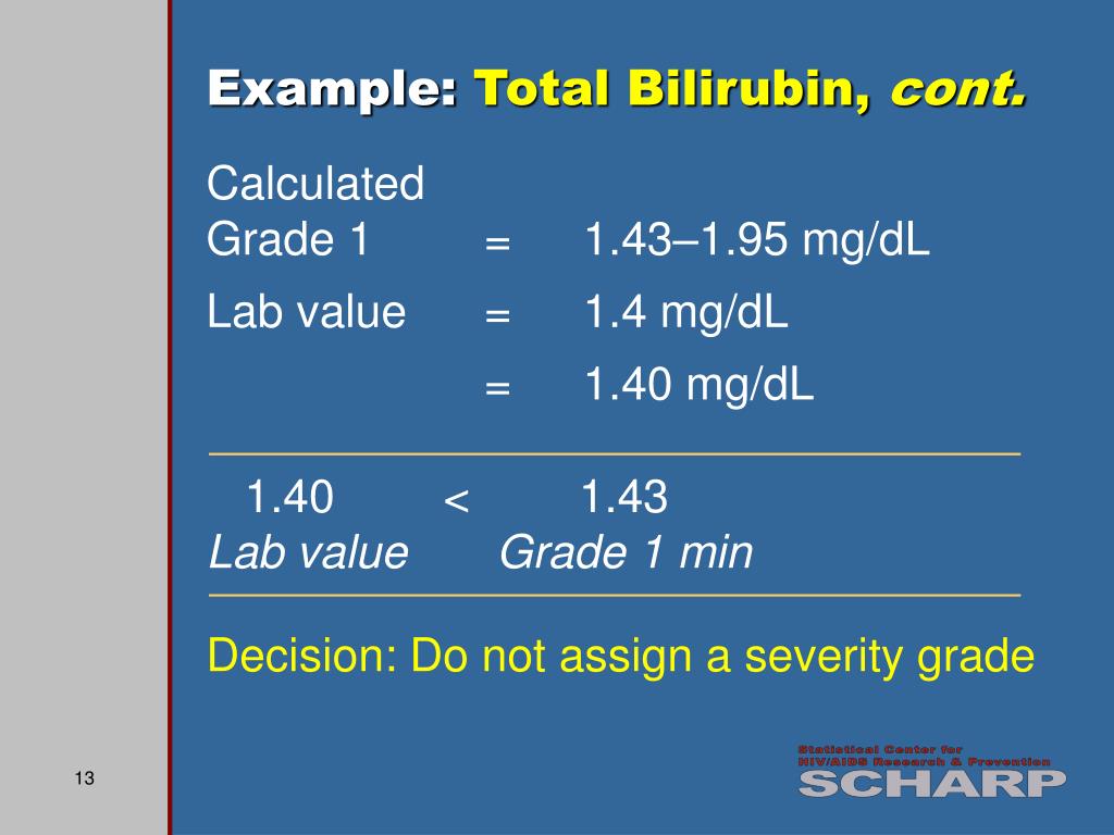 1.40 < 1.43Lab valueGrade 1 min Example: Total Bilirubin, cont. Calculated Grade 1 = 1.43–1.95 mg/dL Lab value = 1.4 mg/dL = 1.40 mg/dL Decision: Do not assign a severity grade