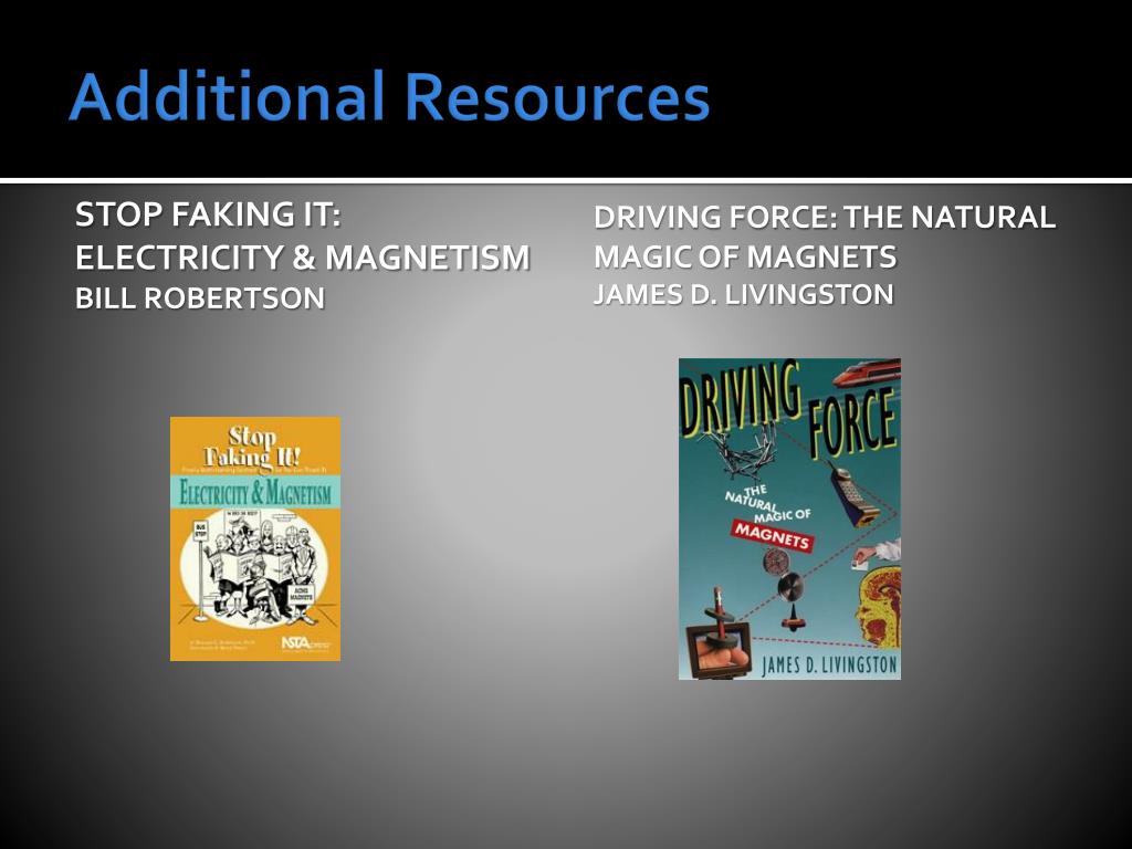 Additional Resources Stop Faking It: Electricity & Magnetism Bill Robertson Driving Force: The Natural Magic of Magnets James D. Livingston