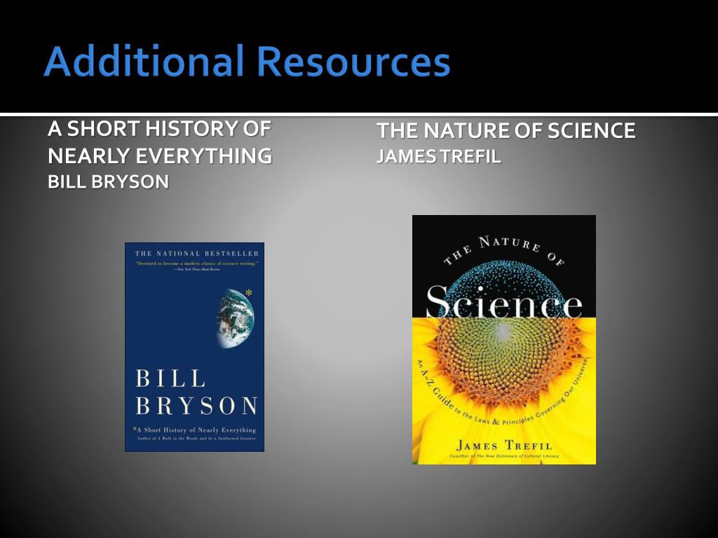Additional Resources A Short History of Nearly Everything Bill Bryson The Nature of Science James Trefil