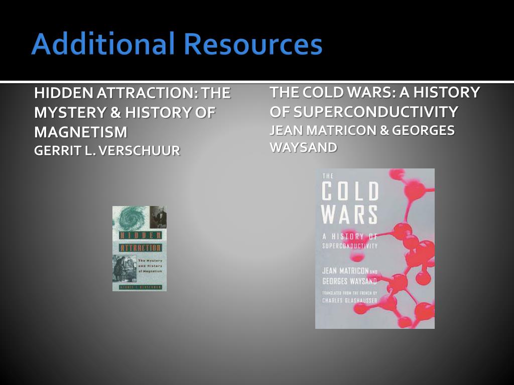 Additional Resources Hidden Attraction: The Mystery & History of Magnetism Gerrit L. Verschuur The Cold Wars: A History of Superconductivity Jean Matricon & Georges Waysand
