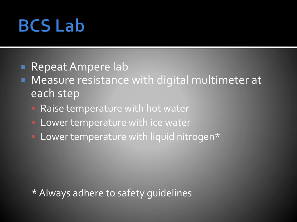 BCS Lab • Repeat Ampere lab • Measure resistance with digital multimeter at each step • Raise temperature with hot water • Lower temperature with ice water • Lower temperature with liquid nitrogen* * Always adhere to safety guidelines
