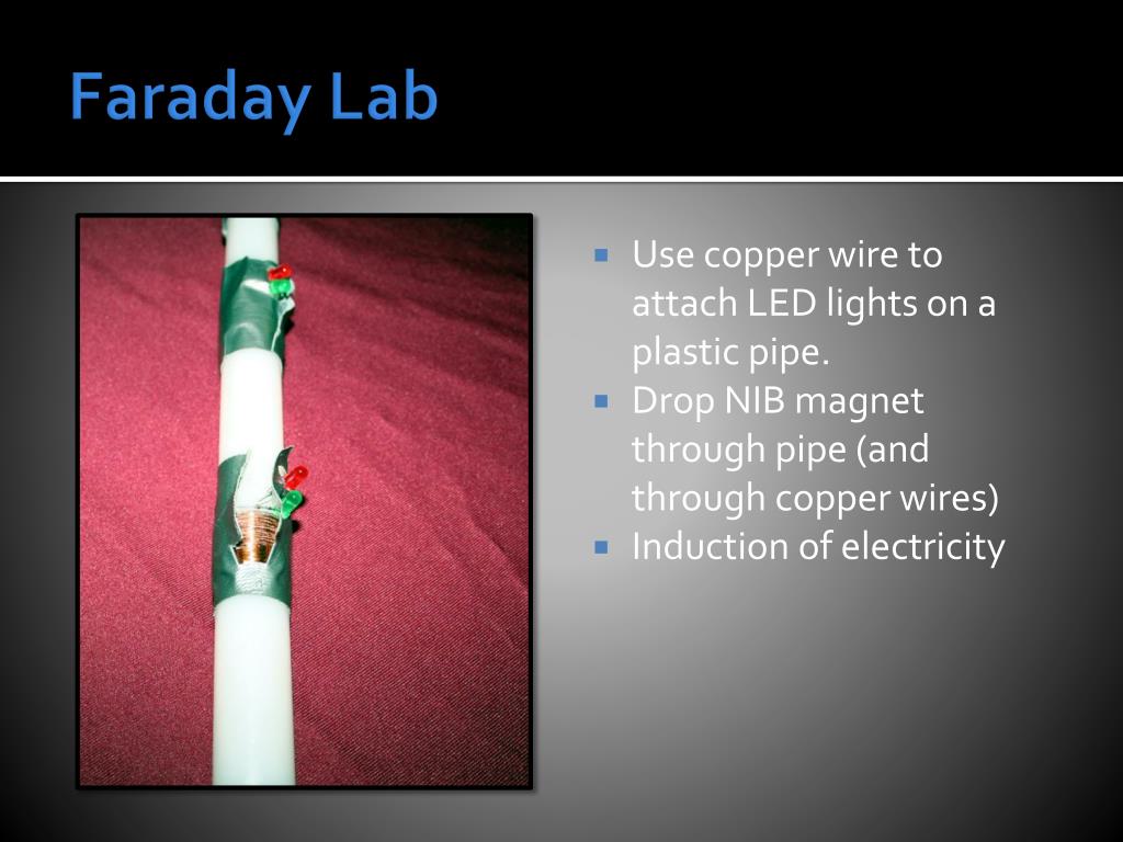 Faraday Lab • Use copper wire to attach LED lights on a plastic pipe. • Drop NIB magnet through pipe (and through copper wires) • Induction of electricity