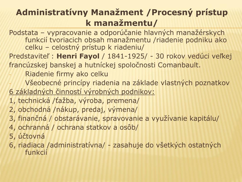 Administratívny Manažment /Procesný prístup k manažmentu/ Podstata – vypracovanie a odporúčanie hlavných manažérskych funkcií tvoriacich obsah manažmentu /riadenie podniku ako celku – celostný prístup k riadeniu/ Predstaviteľ : HenriFayol / 1841-1925/ - 30 rokov vedúci veľkej francúzskej banskej a hutníckej spoločnosti Comanbault. • Riadenie firmy ako celku • Všeobecné princípy riadenia na základe vlastných poznatkov 6 základných činností výrobných podnikov: 1, technická /ťažba, výroba, premena/ 2, obchodná /nákup, predaj, výmena/ 3, finančná / obstarávanie, spravovanie a využívanie kapitálu/ 4, ochranná / ochrana statkov a osôb/ 5, účtovná 6, riadiaca /administratívna/ - zasahuje do všetkých ostatných funkcií