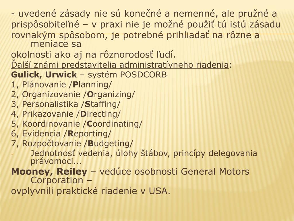 - uvedené zásady nie sú konečné a nemenné, ale pružné a prispôsobiteľné – v praxi nie je možné použiť tú istú zásadu rovnakým spôsobom, je potrebné prihliadať na rôzne a meniace sa okolnosti ako aj na rôznorodosť ľudí. Ďalší známi predstavitelia administratívneho riadenia: Gulick, Urwick – systém POSDCORB 1, Plánovanie /Planning/ 2, Organizovanie /Organizing/ 3, Personalistika /Staffing/ 4, Prikazovanie /Directing/ 5, Koordinovanie /Coordinating/ 6, Evidencia /Reporting/ 7, Rozpočtovanie /Budgeting/ • Jednotnosť vedenia, úlohy štábov, princípy delegovania právomoci... Mooney, Reiley – vedúce osobnosti General Motors Corporation – ovplyvnili praktické riadenie v USA.