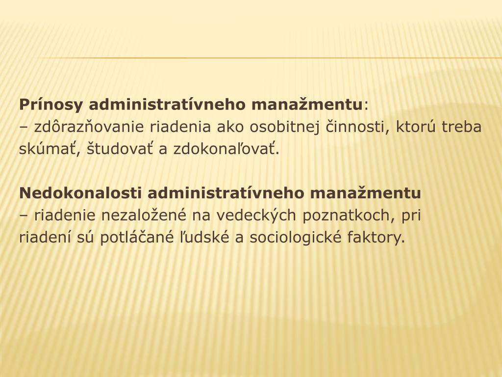 Prínosyadministratívneho manažmentu: – zdôrazňovanie riadenia ako osobitnej činnosti, ktorú treba skúmať, študovať a zdokonaľovať. Nedokonalosti administratívneho manažmentu – riadenie nezaložené na vedeckých poznatkoch, pri riadení sú potláčané ľudské a sociologické faktory.