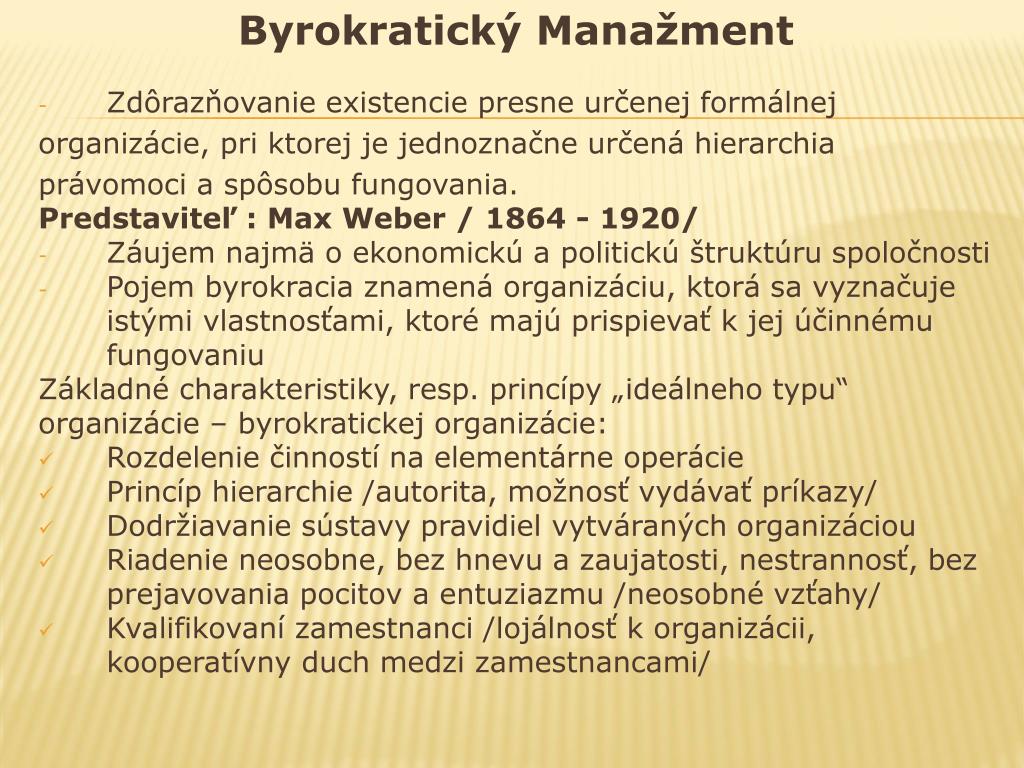 Byrokratický Manažment • Zdôrazňovanie existencie presne určenej formálnej organizácie, pri ktorej je jednoznačne určená hierarchia právomoci a spôsobu fungovania. Predstaviteľ : Max Weber / 1864 - 1920/ • Záujem najmä o ekonomickú a politickú štruktúru spoločnosti • Pojem byrokracia znamená organizáciu, ktorá sa vyznačuje istými vlastnosťami, ktoré majú prispievať k jej účinnému fungovaniu Základné charakteristiky, resp. princípy „ideálneho typu“ organizácie – byrokratickej organizácie: • Rozdelenie činností na elementárne operácie • Princíp hierarchie /autorita, možnosť vydávať príkazy/ • Dodržiavanie sústavy pravidiel vytváraných organizáciou • Riadenie neosobne, bez hnevu a zaujatosti, nestrannosť, bez prejavovania pocitov a entuziazmu /neosobné vzťahy/ • Kvalifikovaní zamestnanci /lojálnosť k organizácii, kooperatívny duch medzi zamestnancami/