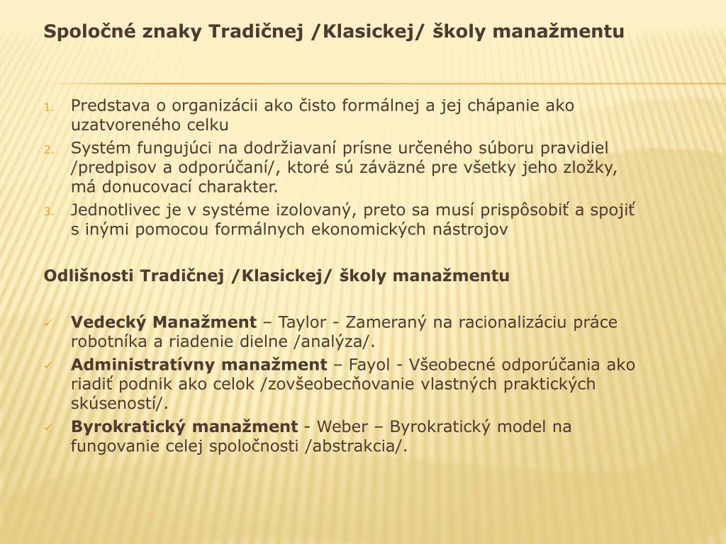Spoločné znaky Tradičnej /Klasickej/ školy manažmentu • Predstava o organizácii ako čisto formálnej a jej chápanie ako uzatvoreného celku • Systém fungujúci na dodržiavaní prísne určeného súboru pravidiel /predpisov a odporúčaní/, ktoré sú záväzné pre všetky jeho zložky, má donucovací charakter. • Jednotlivec je v systéme izolovaný, preto sa musí prispôsobiť a spojiť s inými pomocou formálnych ekonomických nástrojov Odlišnosti Tradičnej /Klasickej/ školy manažmentu • Vedecký Manažment – Taylor - Zameraný na racionalizáciu práce robotníka a riadenie dielne /analýza/. • Administratívny manažment – Fayol - Všeobecné odporúčania ako riadiť podnik ako celok /zovšeobecňovanie vlastných praktických skúseností/. • Byrokratický manažment - Weber – Byrokratický model na fungovanie celej spoločnosti /abstrakcia/.