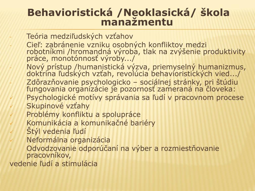 Behavioristická /Neoklasická/ škola manažmentu • Teória medziľudských vzťahov • Cieľ: zabránenie vzniku osobných konfliktov medzi robotníkmi /hromandná výroba, tlak na zvýšenie produktivity práce, monotónnosť výroby.../ • Nový prístup /humanistická výzva, priemyselný humanizmus, doktrína ľudských vzťah, revolúcia behavioristických vied.../ • Zdôrazňovanie psychologicko – sociálnej stránky, pri štúdiu fungovania organizácie je pozornosť zameraná na človeka: • Psychologické motívy správania sa ľudí v pracovnom procese • Skupinové vzťahy • Problémy konfliktu a spolupráce • Komunikácia a komunikačné bariéry • Štýl vedenia ľudí • Neformálna organizácia • Odvodzovanie odporúčaní na výber a rozmiestňovanie pracovníkov, vedenie ľudí a stimulácia