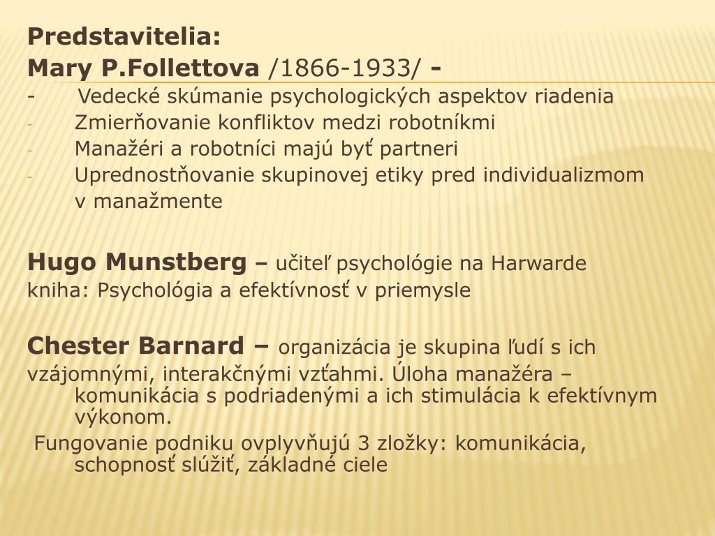 Predstavitelia: Mary P.Follettova/1866-1933/ - - Vedecké skúmanie psychologických aspektov riadenia • Zmierňovanie konfliktov medzi robotníkmi • Manažéri a robotníci majú byť partneri • Uprednostňovanie skupinovej etiky pred individualizmom v manažmente Hugo Munstberg – učiteľ psychológie na Harwarde kniha: Psychológia a efektívnosť v priemysle ChesterBarnard – organizácia je skupina ľudí s ich vzájomnými, interakčnými vzťahmi. Úloha manažéra – komunikácia s podriadenými a ich stimulácia k efektívnym výkonom. Fungovanie podniku ovplyvňujú 3 zložky: komunikácia, schopnosť slúžiť, základné ciele