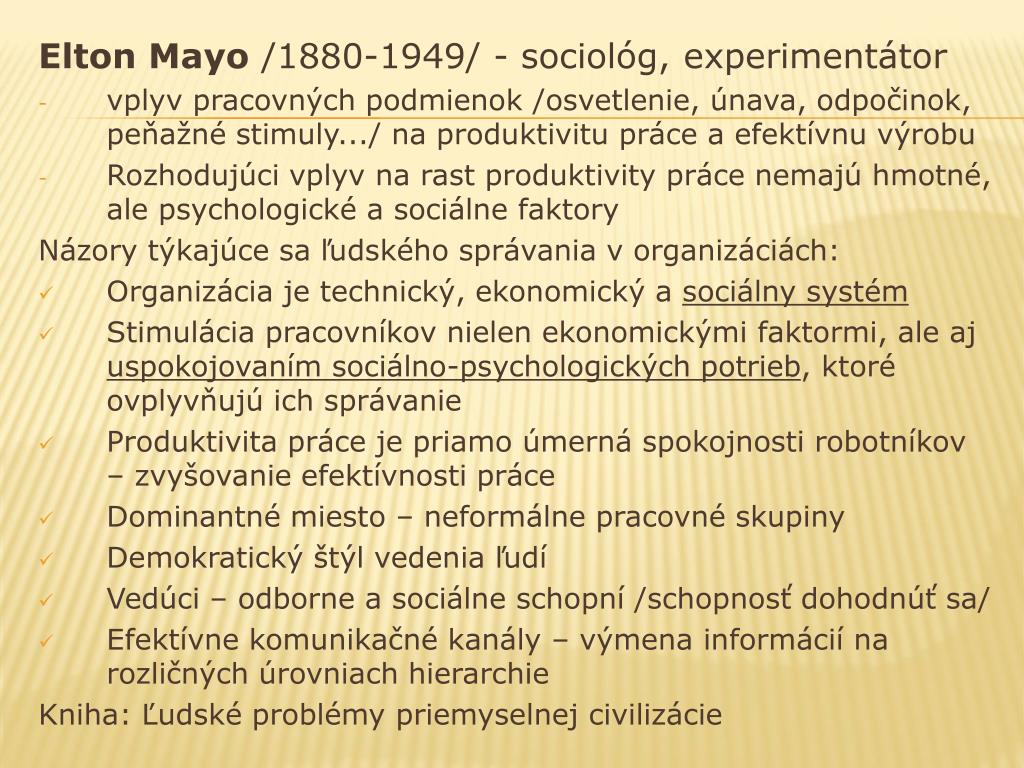 Elton Mayo /1880-1949/ - sociológ, experimentátor • vplyv pracovných podmienok /osvetlenie, únava, odpočinok, peňažné stimuly.../ na produktivitu práce a efektívnu výrobu • Rozhodujúci vplyv na rast produktivity práce nemajú hmotné, ale psychologické a sociálne faktory Názory týkajúce sa ľudského správania v organizáciách: • Organizácia je technický, ekonomický a sociálny systém • Stimulácia pracovníkov nielen ekonomickými faktormi, ale aj uspokojovaním sociálno-psychologických potrieb, ktoré ovplyvňujú ich správanie • Produktivita práce je priamo úmerná spokojnosti robotníkov – zvyšovanie efektívnosti práce • Dominantné miesto – neformálne pracovné skupiny • Demokratický štýl vedenia ľudí • Vedúci – odborne a sociálne schopní /schopnosť dohodnúť sa/ • Efektívne komunikačné kanály – výmena informácií na rozličných úrovniach hierarchie Kniha: Ľudské problémy priemyselnej civilizácie