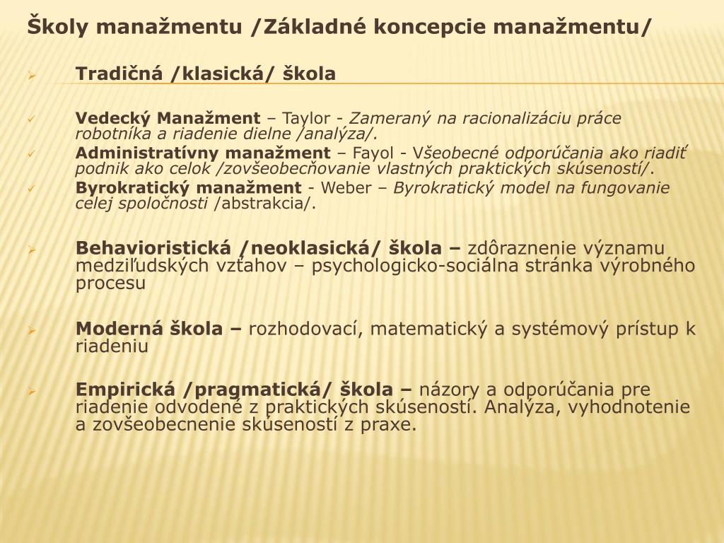 Školy manažmentu /Základné koncepcie manažmentu/ • Tradičná /klasická/ škola • Vedecký Manažment – Taylor - Zameraný na racionalizáciu práce robotníka a riadenie dielne /analýza/. • Administratívny manažment – Fayol - Všeobecné odporúčania ako riadiť podnik ako celok /zovšeobecňovanie vlastných praktických skúseností/. • Byrokratický manažment - Weber – Byrokratický model na fungovanie celej spoločnosti /abstrakcia/. • Behavioristická /neoklasická/ škola – zdôraznenie významu medziľudských vzťahov – psychologicko-sociálna stránka výrobného procesu • Moderná škola – rozhodovací, matematický a systémový prístup k riadeniu • Empirická /pragmatická/ škola – názory a odporúčania pre riadenie odvodené z praktických skúseností. Analýza, vyhodnotenie a zovšeobecnenie skúseností z praxe.