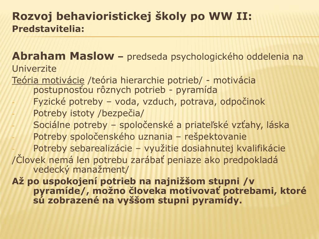 Rozvoj behavioristickej školy po WW II: Predstavitelia: AbrahamMaslow – predseda psychologického oddelenia na Univerzite Teória motivácie /teória hierarchie potrieb/ - motivácia postupnosťourôznych potrieb - pyramída • Fyzické potreby – voda, vzduch, potrava, odpočinok • Potreby istoty /bezpečia/ • Sociálne potreby – spoločenské a priateľské vzťahy, láska • Potreby spoločenského uznania – rešpektovanie • Potreby sebarealizácie – využitie dosiahnutej kvalifikácie /Človek nemá len potrebu zarábať peniaze ako predpokladá vedecký manažment/ Až po uspokojení potrieb na najnižšom stupni /v pyramíde/, možno človeka motivovať potrebami, ktoré sú zobrazené na vyššom stupni pyramídy.
