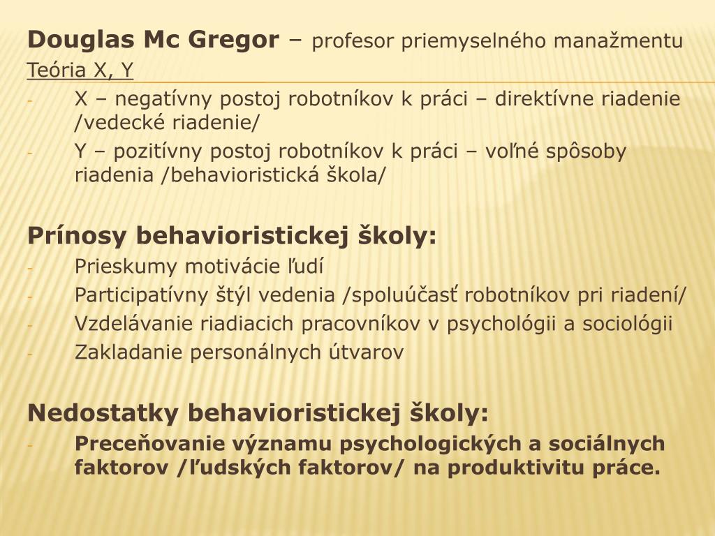 DouglasMc Gregor – profesor priemyselného manažmentu Teória X, Y • X – negatívny postoj robotníkov k práci – direktívne riadenie /vedecké riadenie/ • Y – pozitívny postoj robotníkov k práci – voľné spôsoby riadenia /behavioristická škola/ Prínosy behavioristickej školy: • Prieskumy motivácie ľudí • Participatívny štýl vedenia /spoluúčasť robotníkov pri riadení/ • Vzdelávanie riadiacich pracovníkov v psychológii a sociológii • Zakladanie personálnych útvarov Nedostatky behavioristickej školy: • Preceňovanie významu psychologických a sociálnych faktorov /ľudských faktorov/ na produktivitu práce.