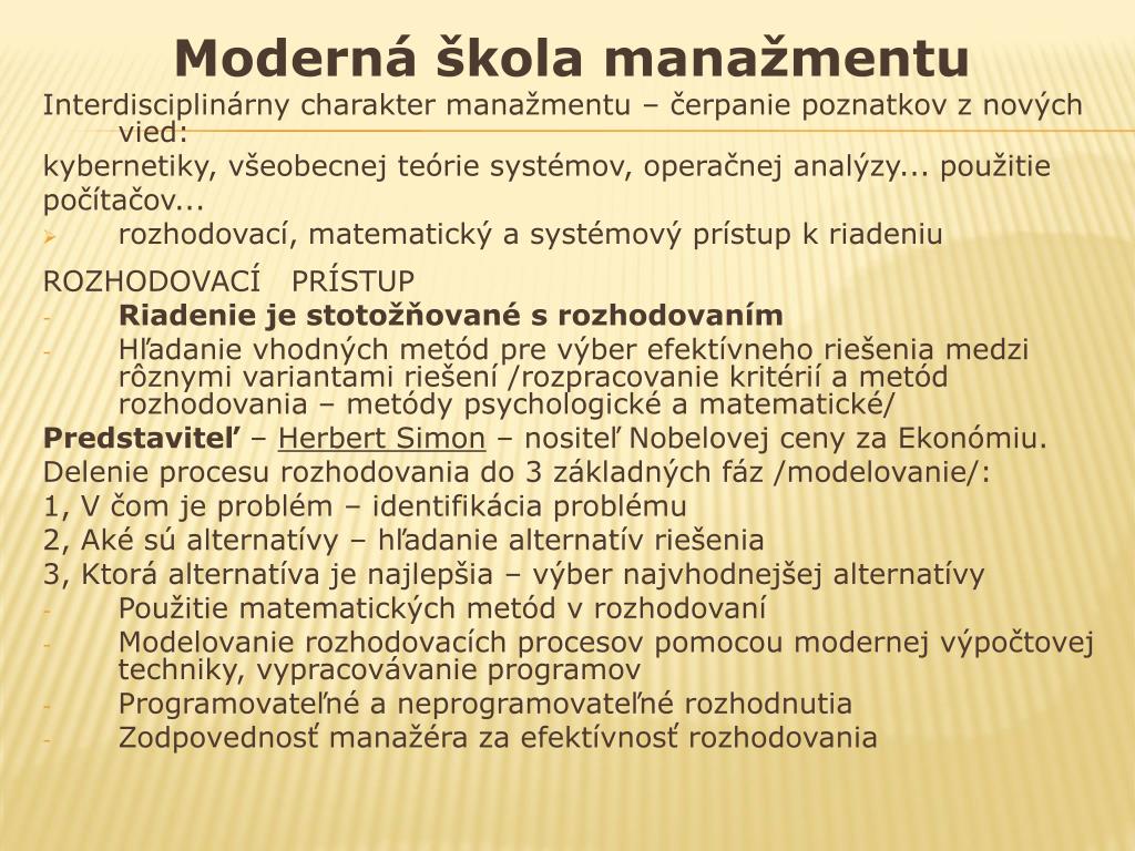 Moderná škola manažmentu Interdisciplinárny charakter manažmentu – čerpanie poznatkov z nových vied: kybernetiky, všeobecnej teórie systémov, operačnej analýzy... použitie počítačov... • rozhodovací, matematický a systémový prístup k riadeniu ROZHODOVACÍ PRÍSTUP • Riadenie je stotožňované s rozhodovaním • Hľadanie vhodných metód pre výber efektívneho riešenia medzi rôznymi variantami riešení /rozpracovanie kritérií a metód rozhodovania – metódy psychologické a matematické/ Predstaviteľ – Herbert Simon – nositeľ Nobelovej ceny za Ekonómiu. Delenie procesu rozhodovania do 3 základných fáz /modelovanie/: 1, V čom je problém – identifikácia problému 2, Aké sú alternatívy – hľadanie alternatív riešenia 3, Ktorá alternatíva je najlepšia – výber najvhodnejšej alternatívy • Použitie matematických metód v rozhodovaní • Modelovanie rozhodovacích procesov pomocou modernej výpočtovej techniky, vypracovávanie programov • Programovateľné a neprogramovateľné rozhodnutia • Zodpovednosť manažéra za efektívnosť rozhodovania