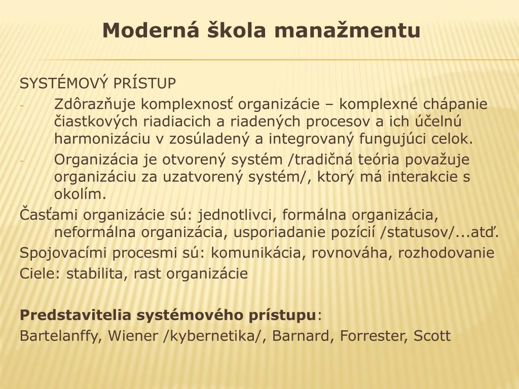Moderná škola manažmentu SYSTÉMOVÝ PRÍSTUP • Zdôrazňuje komplexnosť organizácie – komplexné chápanie čiastkových riadiacich a riadených procesov a ich účelnú harmonizáciu v zosúladený a integrovaný fungujúci celok. • Organizácia je otvorený systém /tradičná teória považuje organizáciu za uzatvorený systém/, ktorý má interakcie s okolím. Časťami organizácie sú: jednotlivci, formálna organizácia, neformálna organizácia, usporiadanie pozícií /statusov/...atď. Spojovacími procesmi sú: komunikácia, rovnováha, rozhodovanie Ciele: stabilita, rast organizácie Predstavitelia systémového prístupu: Bartelanffy, Wiener /kybernetika/, Barnard, Forrester, Scott