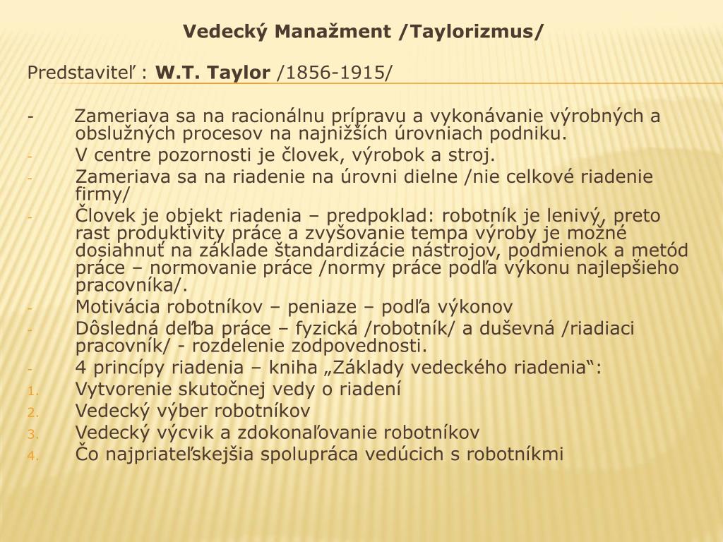 Vedecký Manažment /Taylorizmus/ Predstaviteľ : W.T. Taylor /1856-1915/ - Zameriava sa na racionálnu prípravu a vykonávanie výrobných a obslužných procesov na najnižších úrovniach podniku. • V centre pozornosti je človek, výrobok a stroj. • Zameriava sa na riadenie na úrovni dielne /nie celkové riadenie firmy/ • Človek je objekt riadenia – predpoklad: robotník je lenivý, preto rast produktivity práce a zvyšovanie tempa výroby je možné dosiahnuť na základe štandardizácie nástrojov, podmienok a metód práce – normovanie práce /normy práce podľa výkonu najlepšieho pracovníka/. • Motivácia robotníkov – peniaze – podľa výkonov • Dôsledná deľba práce – fyzická /robotník/ a duševná /riadiaci pracovník/ - rozdelenie zodpovednosti. • 4 princípy riadenia – kniha „Základy vedeckého riadenia“: • Vytvorenie skutočnej vedy o riadení • Vedecký výber robotníkov • Vedecký výcvik a zdokonaľovanie robotníkov • Čo najpriateľskejšia spolupráca vedúcich s robotníkmi