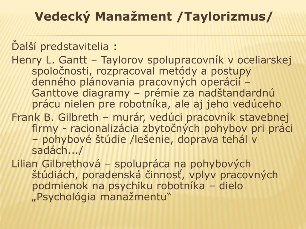 Vedecký Manažment /Taylorizmus/ Ďalší predstavitelia : Henry L. Gantt – Taylorov spolupracovník v oceliarskej spoločnosti, rozpracoval metódy a postupy denného plánovania pracovných operácií – Ganttove diagramy – prémie za nadštandardnú prácu nielen pre robotníka, ale aj jeho vedúceho Frank B. Gilbreth – murár, vedúci pracovník stavebnej firmy - racionalizácia zbytočných pohybov pri práci – pohybové štúdie /lešenie, doprava tehál v sadách.../ Lilian Gilbrethová – spolupráca na pohybových štúdiách, poradenská činnosť, vplyv pracovných podmienok na psychiku robotníka – dielo „Psychológia manažmentu“