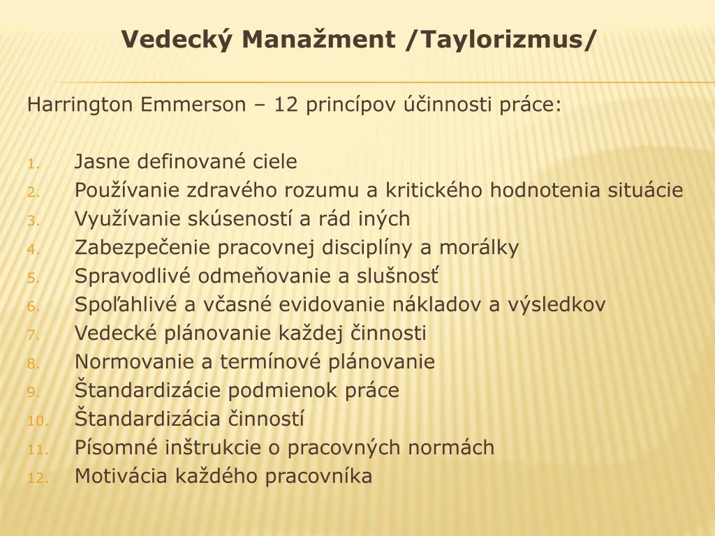 Vedecký Manažment /Taylorizmus/ Harrington Emmerson – 12 princípov účinnosti práce: Jasne definované ciele Používanie zdravého rozumu a kritického hodnotenia situácie Využívanie skúseností a rád iných Zabezpečenie pracovnej disciplíny a morálky Spravodlivé odmeňovanie a slušnosť Spoľahlivé a včasné evidovanie nákladov a výsledkov Vedecké plánovanie každej činnosti Normovanie a termínové plánovanie Štandardizácie podmienok práce Štandardizácia činností Písomné inštrukcie o pracovných normách Motivácia každého pracovníka