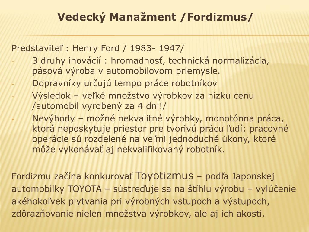 Vedecký Manažment /Fordizmus/ Predstaviteľ : Henry Ford / 1983- 1947/ • 3 druhy inovácií : hromadnosť, technická normalizácia, pásová výroba v automobilovom priemysle. • Dopravníky určujú tempo práce robotníkov • Výsledok – veľké množstvo výrobkov za nízku cenu /automobil vyrobený za 4 dni!/ • Nevýhody – možné nekvalitné výrobky, monotónna práca, ktorá neposkytuje priestor pre tvorivú prácu ľudí: pracovné operácie sú rozdelené na veľmi jednoduché úkony, ktoré môže vykonávať aj nekvalifikovaný robotník. Fordizmu začína konkurovať Toyotizmus – podľa Japonskej automobilky TOYOTA – sústreďuje sa na štíhlu výrobu – vylúčenie akéhokoľvek plytvania pri výrobných vstupoch a výstupoch, zdôrazňovanie nielen množstva výrobkov, ale aj ich akosti.