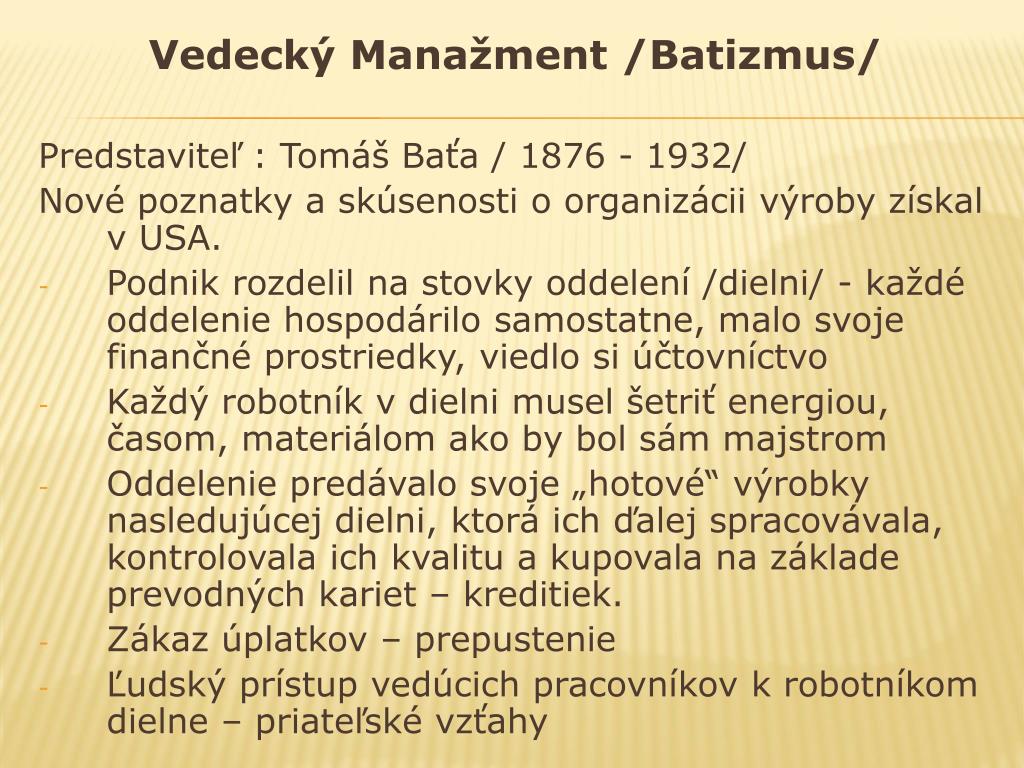 Vedecký Manažment /Batizmus/ Predstaviteľ : Tomáš Baťa / 1876 - 1932/ Nové poznatky a skúsenosti o organizácii výroby získal v USA. • Podnik rozdelil na stovky oddelení /dielni/ - každé oddelenie hospodárilo samostatne, malo svoje finančné prostriedky, viedlo si účtovníctvo • Každý robotník v dielni musel šetriť energiou, časom, materiálom ako by bol sám majstrom • Oddelenie predávalo svoje „hotové“ výrobky nasledujúcej dielni, ktorá ich ďalej spracovávala, kontrolovala ich kvalitu a kupovala na základe prevodných kariet – kreditiek. • Zákaz úplatkov – prepustenie • Ľudský prístup vedúcich pracovníkov k robotníkom dielne – priateľské vzťahy