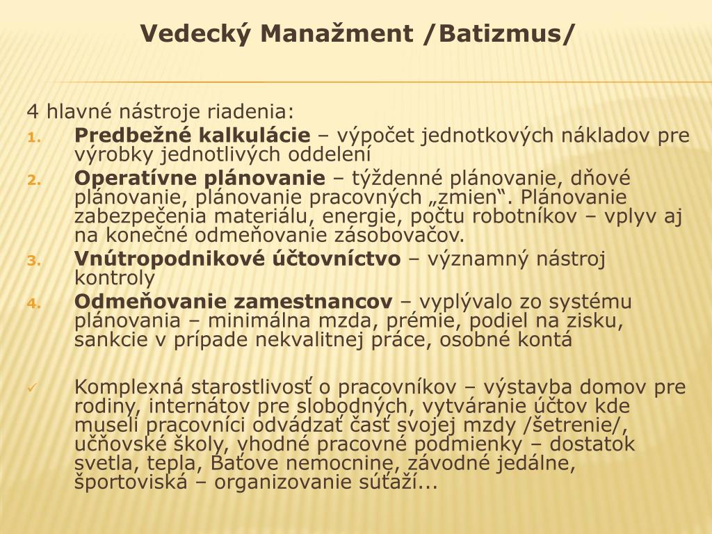 Vedecký Manažment /Batizmus/ 4 hlavné nástroje riadenia: • Predbežné kalkulácie – výpočet jednotkových nákladov pre výrobky jednotlivých oddelení • Operatívne plánovanie – týždenné plánovanie, dňové plánovanie, plánovanie pracovných „zmien“. Plánovanie zabezpečenia materiálu, energie, počtu robotníkov – vplyv aj na konečné odmeňovanie zásobovačov. • Vnútropodnikové účtovníctvo – významný nástroj kontroly • Odmeňovanie zamestnancov – vyplývalo zo systému plánovania – minimálna mzda, prémie, podiel na zisku, sankcie v prípade nekvalitnej práce, osobné kontá • Komplexná starostlivosť o pracovníkov – výstavba domov pre rodiny, internátov pre slobodných, vytváranie účtov kde museli pracovníci odvádzať časť svojej mzdy /šetrenie/, učňovské školy, vhodné pracovné podmienky – dostatok svetla, tepla, Baťovenemocnine, závodné jedálne, športoviská – organizovanie súťaží...