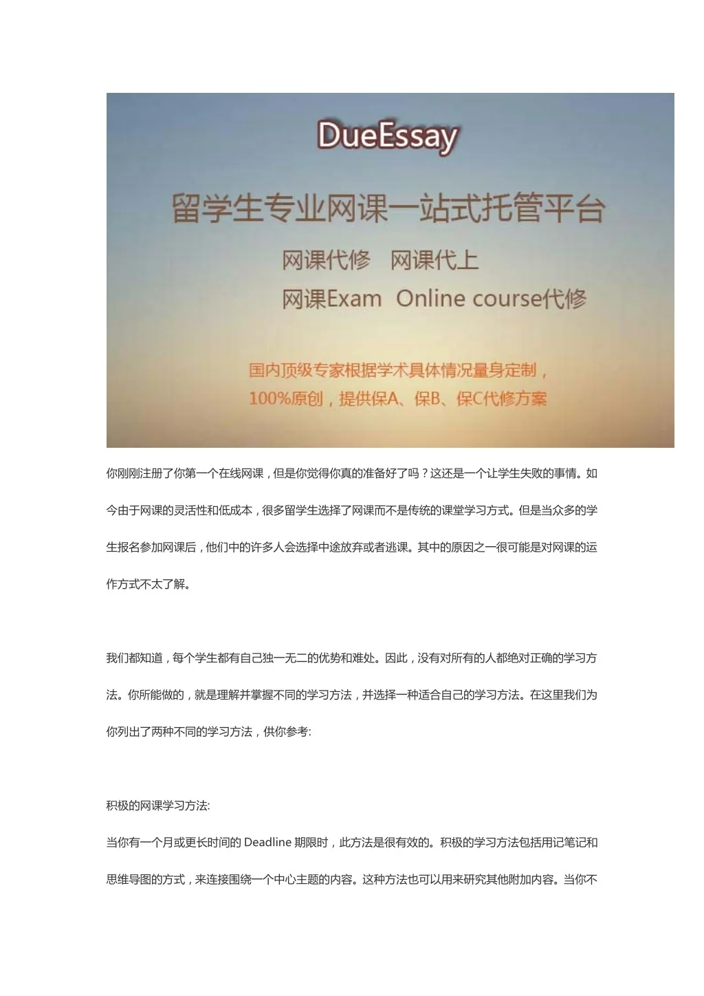 你刚刚注册了你第一个在线网课,但是你觉得你真的准备好了吗?这还是一个让学生失败的事情。如你刚刚注册了你第一个在线网课,但是你觉得你真的准备好了吗?这还是一个让学生失败的事情。如 今由于网课的灵活性和低成本,很多留学生选择了网课而不是传统的课堂学习方式。但是当众多的学 生报名参加网课后,他们中的许多人会选择中途放弃或者逃课。其中的原因之一很可能是对网课的运 作方式不太了解。 我们都知道,每个学生都有自己独一无二的优势和难处。因此,没有对所有的人都绝对正确的学习方 法。你所能做的,就是理解并掌握不同的学习方法,并选择一种适合自己的学习方法。在这里我们为 你列出了两种不同的学习方法,供你参考: 积极的网课学习方法: 当你有一个月或更长时间的 Deadline 期限时,此方法是很有效的。积极的学习方法包括用记笔记和 思维导图的方式,来连接围绕一个中心主题的内容。这种方法也可以用来研究其他附加内容。当你不