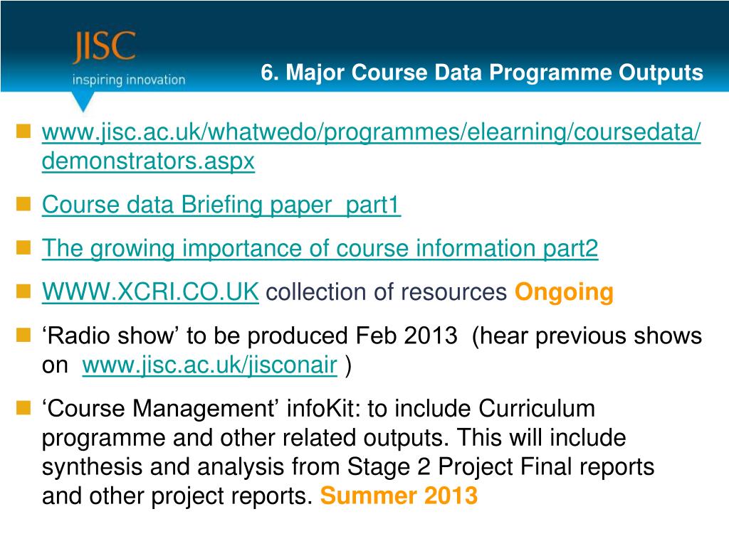 6. Major Course Data Programme Outputs Jisc ‘Course Data: Making the most of Course Information’ Capital Programme - Call for Letters of Commitment: Para 29. The lead institution or one of its partners must agree to host the website on their server for a minimum of 3 years after the end of the project (ie to March 2016) and to assist Jisc in archiving it subsequently. This website should link to all the projects digital outputs as listed in your project plan that accompanied the grant letter emailed in Dec 2011, unless amendments have been previously agreed with Ruth Drysdale.