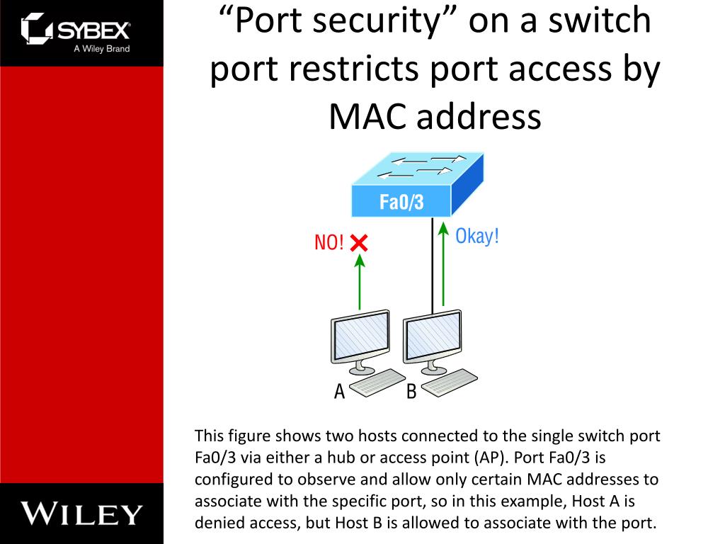 “Port security” on a switch port restricts port access by MAC address This figure shows two hosts connected to the single switch port Fa0/3 via either a hub or access point (AP).Port Fa0/3 is configured to observe and allow only certain MAC addresses to associate with the specific port, so in this example, Host A is denied access, but Host B is allowed to associate with the port.