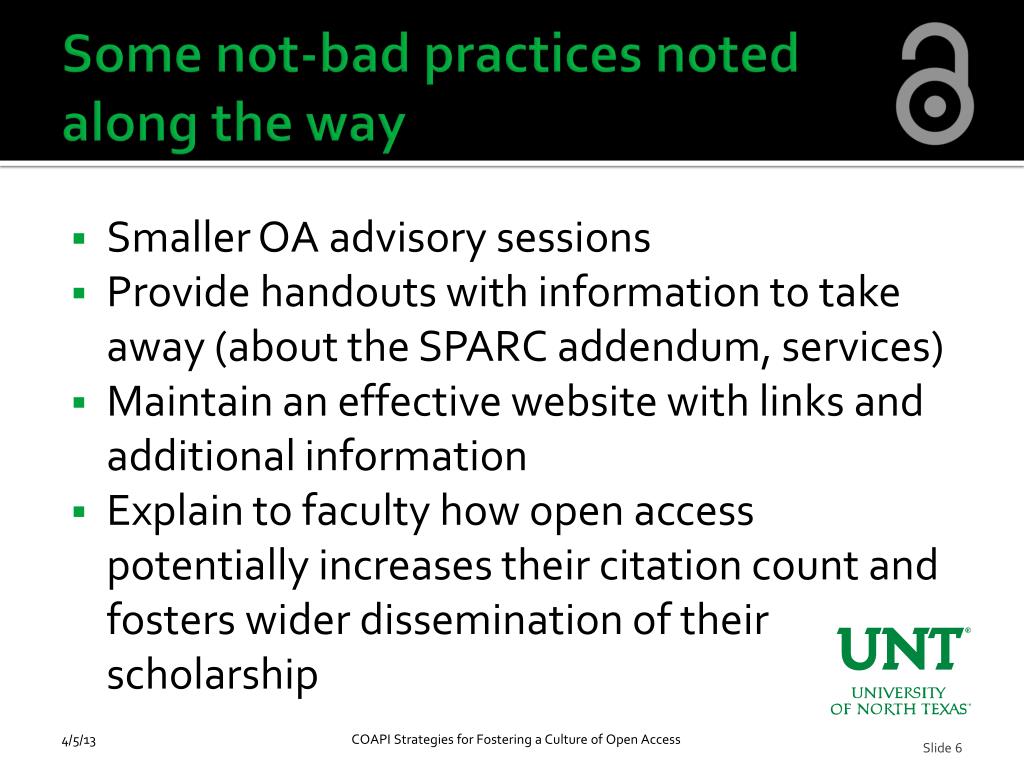 Some not-bad practices noted along the way Smaller OA advisory sessions Provide handouts with information to take away (about the SPARC addendum, services) Maintain an effective website with links and additional information Explain to faculty how open access potentially increases their citation count and fosters wider dissemination of their scholarship COAPI Strategies for Fostering a Culture of Open Access