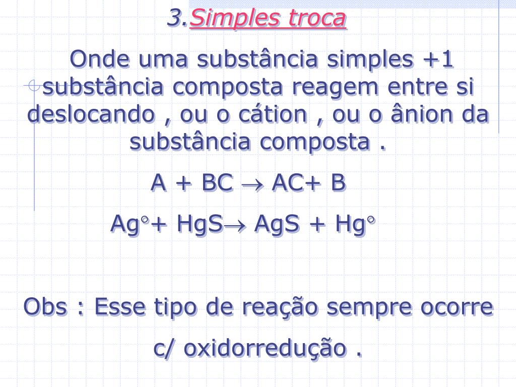 3.Simples troca Onde uma substância simples +1 substância composta reagem entre si deslocando , ou o cátion , ou o ânion da substância composta . A + BC AC+ B Ag°+ HgS AgS + Hg° Obs : Esse tipo de reação sempre ocorre c/ oxidorredução .