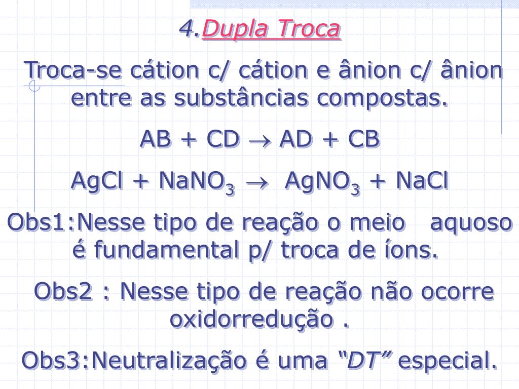 4.Dupla Troca Troca-se cátion c/ cátion e ânion c/ ânion entre as substâncias compostas. AB + CD AD + CB AgCl + NaNO3 AgNO3 + NaCl Obs1:Nesse tipo de reação o meio aquoso é fundamental p/ troca de íons. Obs2 : Nesse tipo de reação não ocorre oxidorredução . Obs3:Neutralização é uma “DT” especial.