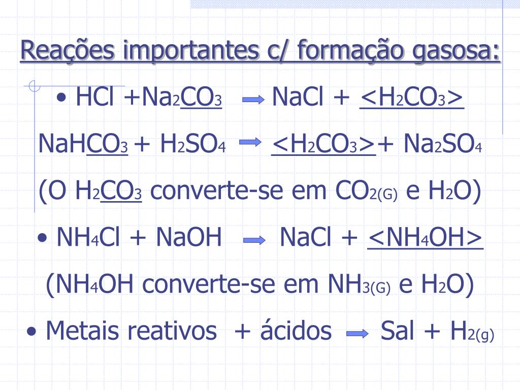 Reações importantes c/ formação gasosa: • HCl +Na2CO3NaCl + <H2CO3> • NaHCO3+ H2SO4 <H2CO3>+ Na2SO4 • (O H2CO3 converte-se em CO2(G) e H2O) • NH4Cl + NaOH NaCl + <NH4OH> • (NH4OH converte-se em NH3(G) e H2O) • Metais reativos + ácidos Sal + H2(g)
