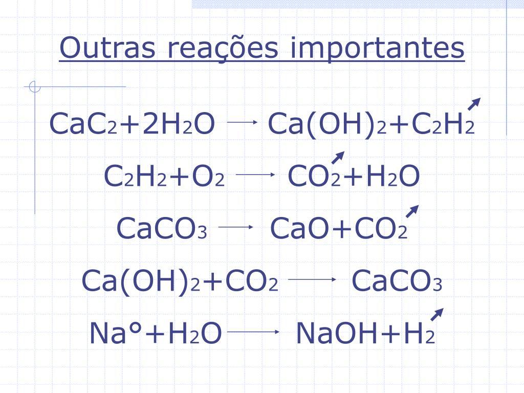 Outras reações importantes CaC2+2H2O Ca(OH)2+C2H2 C2H2+O2 CO2+H2O CaCO3 CaO+CO2 Ca(OH)2+CO2 CaCO3 Na°+H2O NaOH+H2