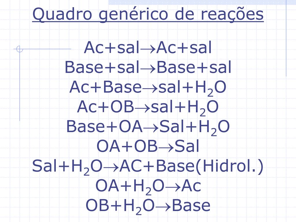Quadro genérico de reações Ac+salAc+sal Base+salBase+sal Ac+Basesal+H2O Ac+OBsal+H2O Base+OASal+H2O OA+OBSal Sal+H2OAC+Base(Hidrol.) OA+H2OAc OB+H2OBase