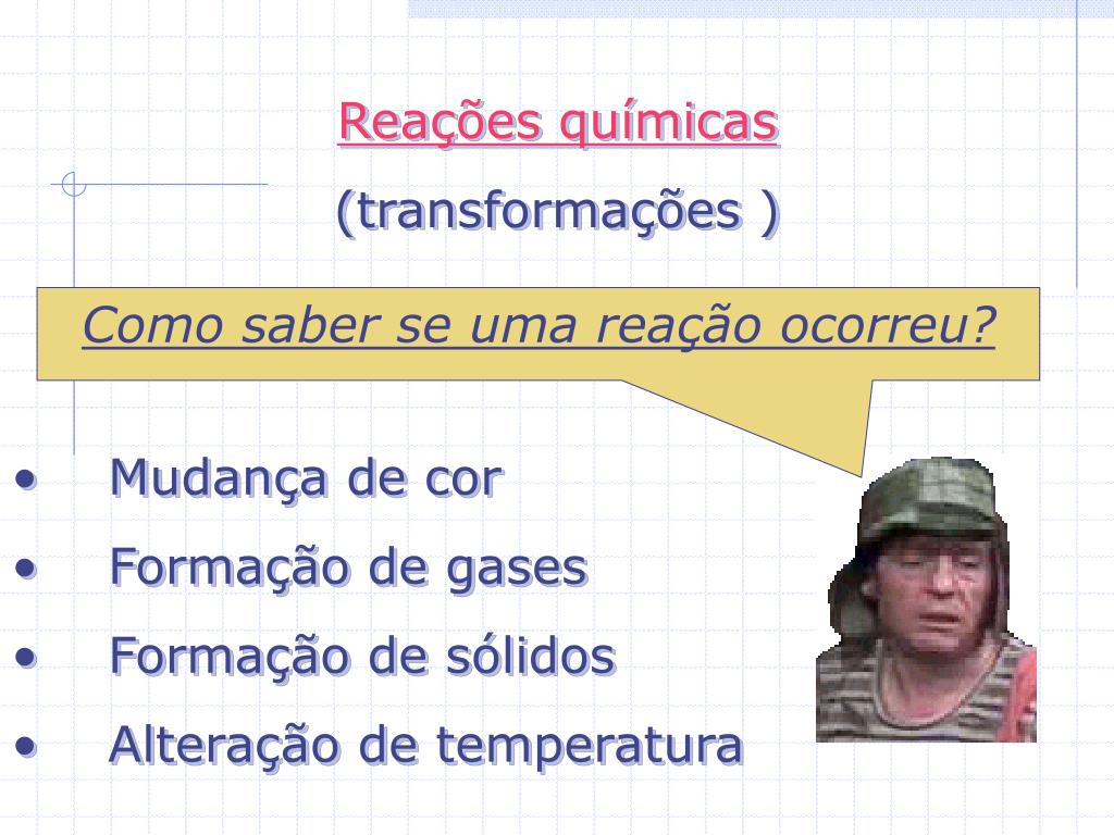 Reações químicas • (transformações ) • Mudança de cor • Formação de gases • Formação de sólidos • Alteração de temperatura Como saber se uma reação ocorreu?