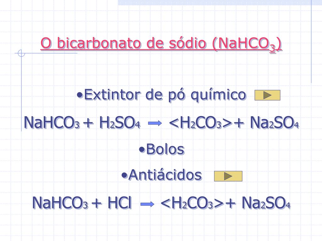 O bicarbonato de sódio (NaHCO3) • Extintor de pó químico • NaHCO3 + H2SO4 <H2CO3>+ Na2SO4 • Bolos • Antiácidos • NaHCO3 + HCl <H2CO3>+ Na2SO4
