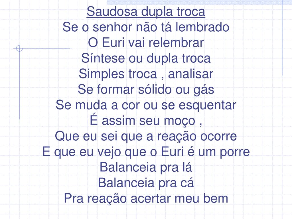 Saudosa dupla troca Se o senhor não tá lembrado O Euri vai relembrar Síntese ou dupla troca Simples troca , analisar Se formar sólido ou gás Se muda a cor ou se esquentar É assim seu moço , Que eu sei que a reação ocorre E que eu vejo que o Euri é um porre Balanceia pra lá Balanceia pra cá Pra reação acertar meu bem