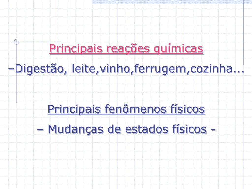 Principais reações químicas –Digestão, leite,vinho,ferrugem,cozinha... Principais fenômenos físicos – Mudanças de estados físicos -