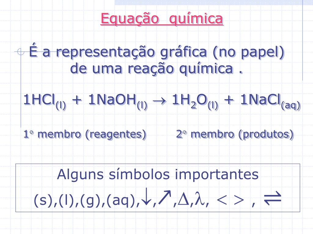Equação química É a representação gráfica (no papel) de uma reação química . 1HCl(l) + 1NaOH(l) 1H2O(l) + 1NaCl(aq) 1° membro (reagentes) 2° membro (produtos) Alguns símbolos importantes (s),(l),(g),(aq),,↗,,, ,⇌