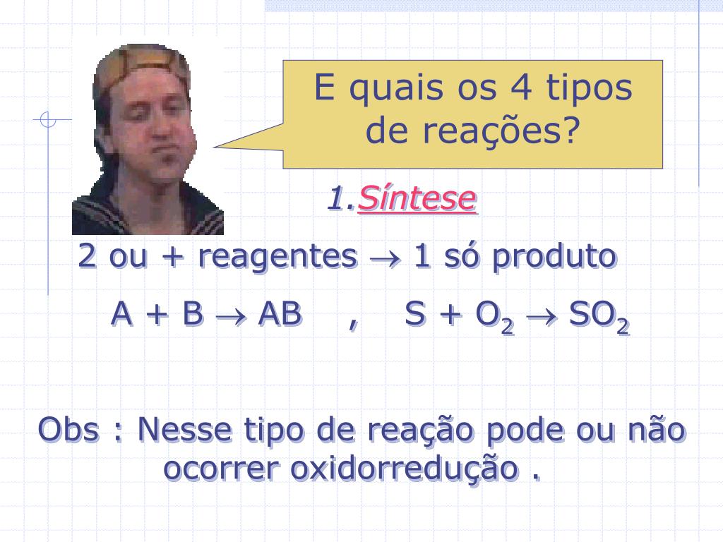 1.Síntese 2 ou + reagentes 1 só produto A + B AB , S + O2 SO2 Obs : Nesse tipo de reação pode ou não ocorrer oxidorredução . E quais os 4 tipos de reações?